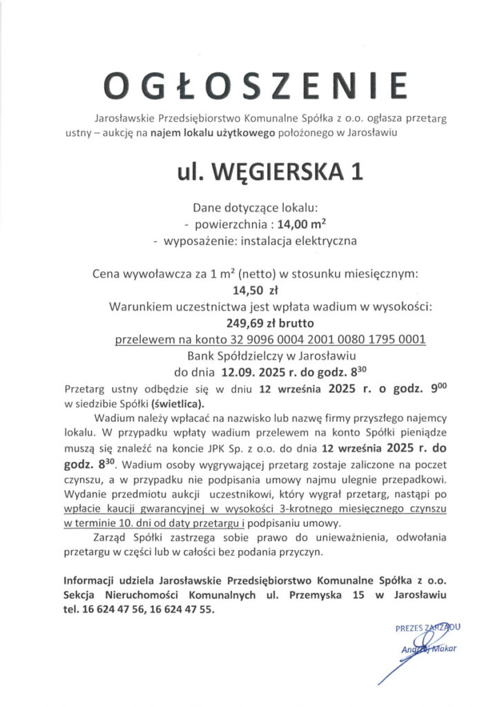 Jarosławskie Przedsiębiorstwo Komunalne Spółka z o.o. ogłasza przetarg ustny – aukcję na najem lokalu użytkowego położonego w Jarosławiu, ul. Węgierska 1 (14,00 m2).