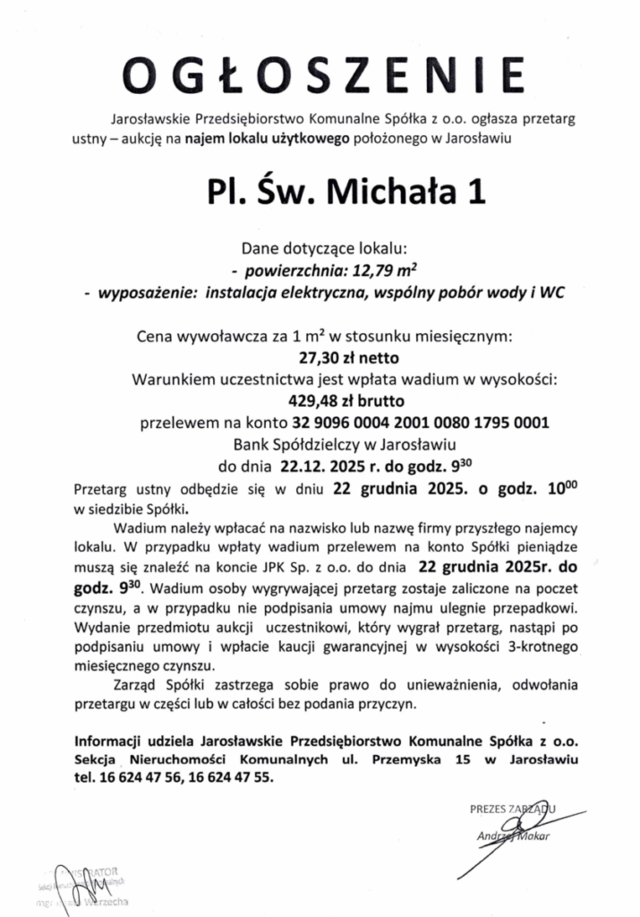 Jarosławskie Przedsiębiorstwo Komunalne Spółka z o.o. ogłasza przetarg ustny – aukcję na najem lokalu użytkowego położonego w Jarosławiu, Pl. Św. Michała 1 (12,79 m2).