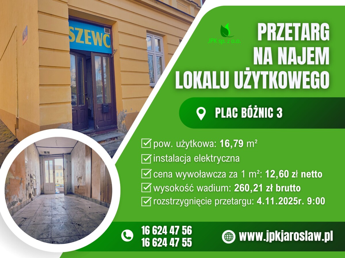 10 listopada 2025Przetarg ustny – Plac Bożnic 3 (16,79 m2)Jarosławskie Przedsiębiorstwo Komunalne Spółka z o.o. ogłasza przetarg ustny – aukcję na najem lokalu użytkowego położonego w Jarosławiu, Plac Bożnic 3 (16,79 m2).Czytaj więcej